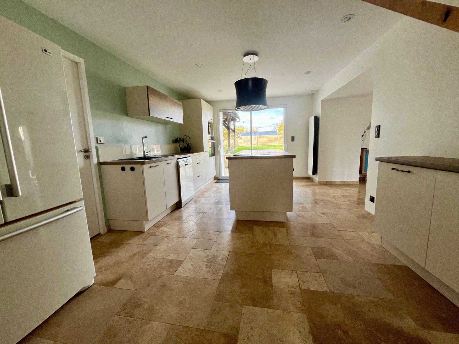 La cuisine semi-ouverte, aménagée et équipée, s’ouvre naturellement vers l’extérieur, prolongeant les moments de partage à l’intérieur comme à l’extérieur.