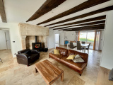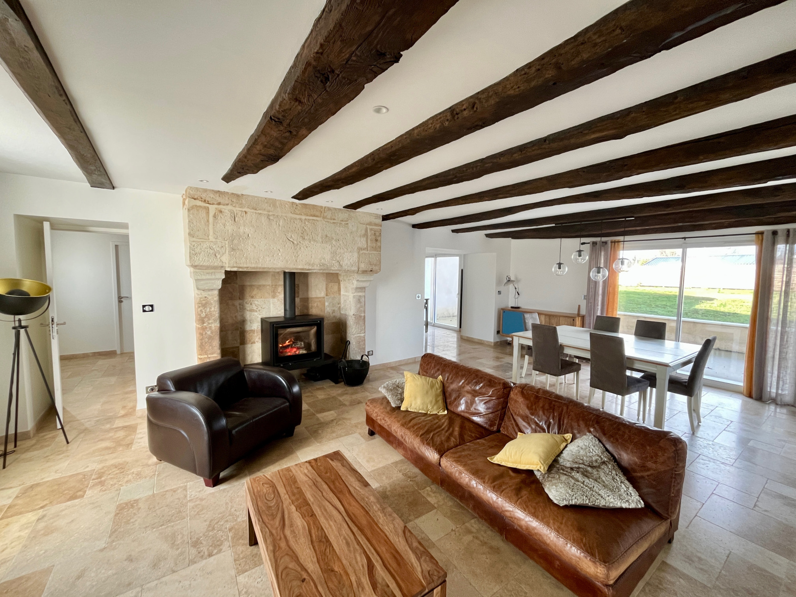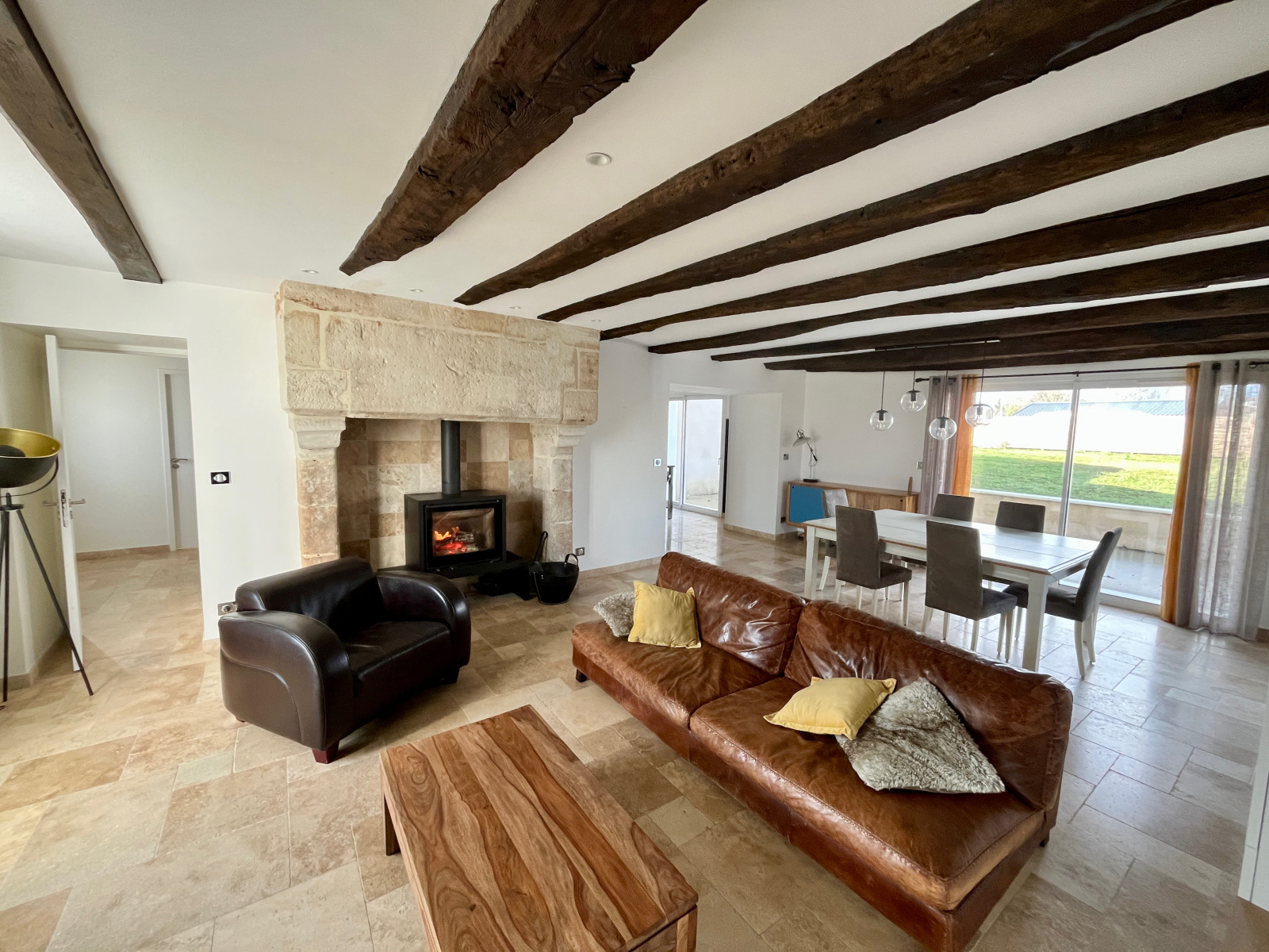 La pièce de vie, généreuse et baignée de lumière, s’organise autour d’un insert à bois, véritable signature chaleureuse de la maison. La cuisine semi-ouverte, aménagée et équipée, s’ouvre naturellement vers l’extérieur, prolongeant les moments de partage à l’intérieur comme à l’extérieur.