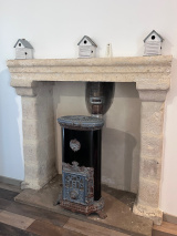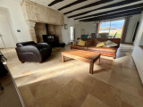 La pièce de vie, généreuse et baignée de lumière, s’organise autour d’un insert à bois, véritable signature chaleureuse de la maison.